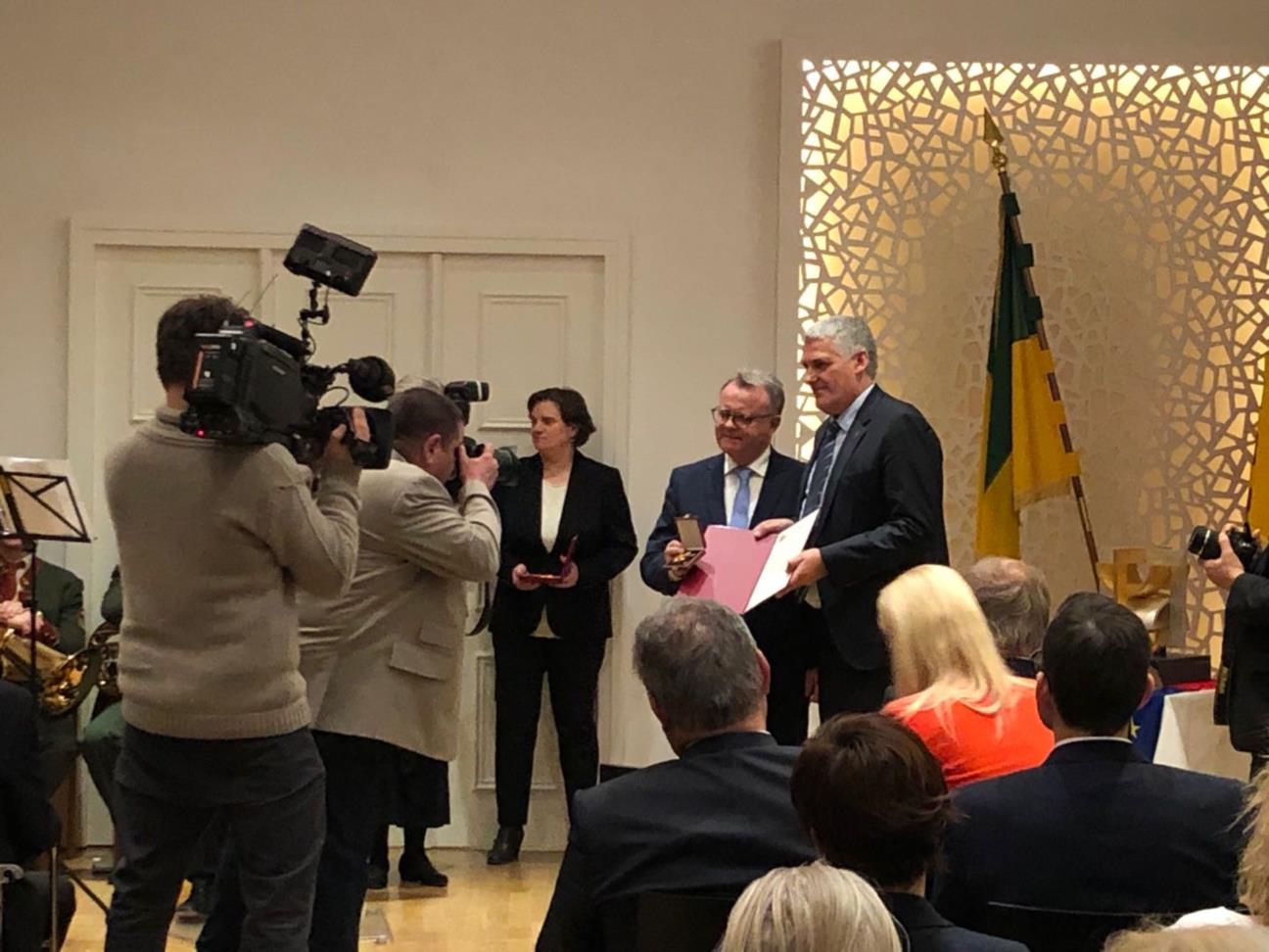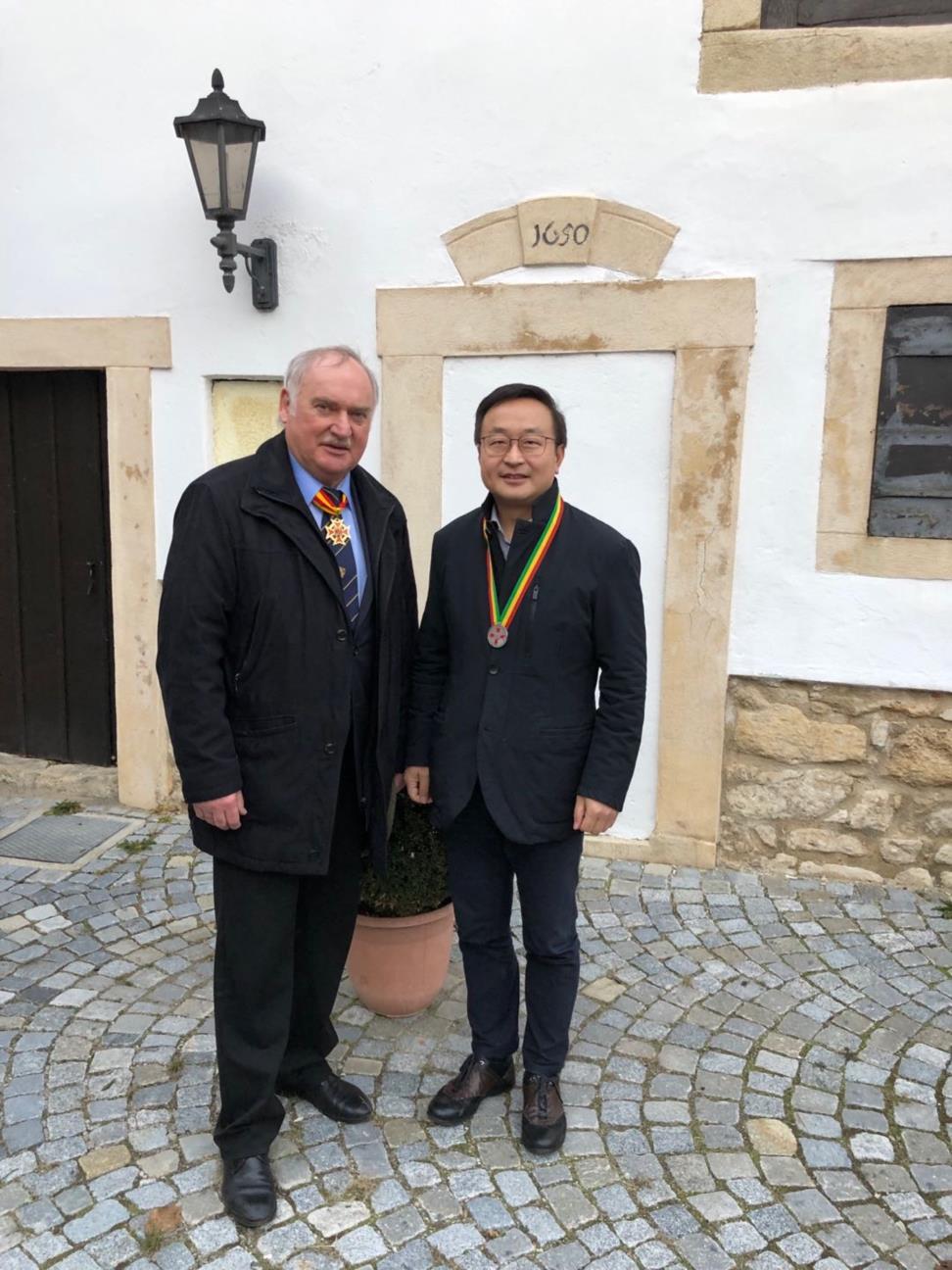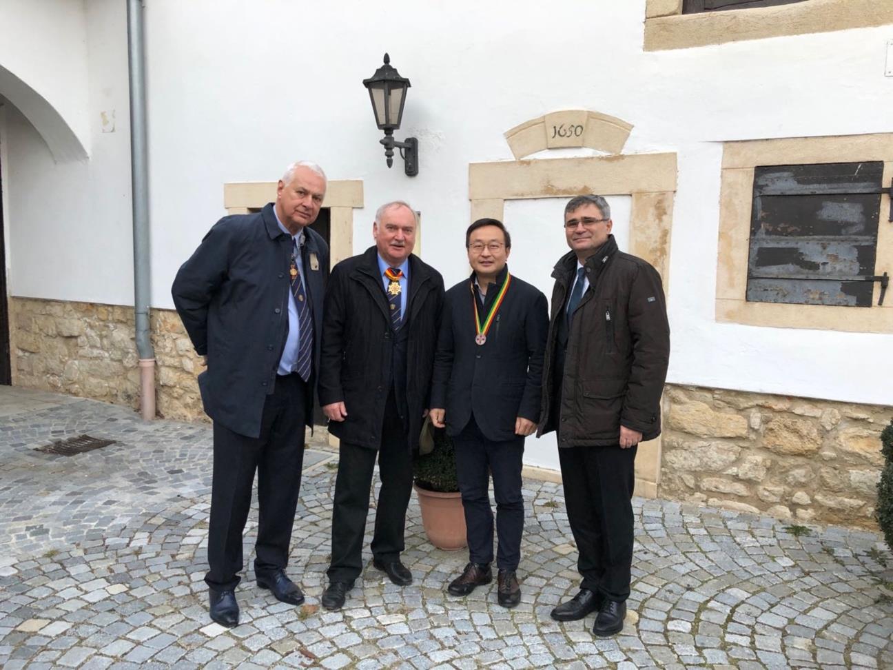 2019年2⽉25⽇,布尔根兰州州⻓Niessl在Rust为欧洲葡萄酒骑⼠团⼏位做出卓越贡献的成员颁发荣誉证书,协会主席詹伟平应邀出席活动