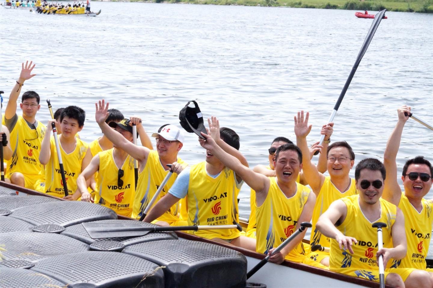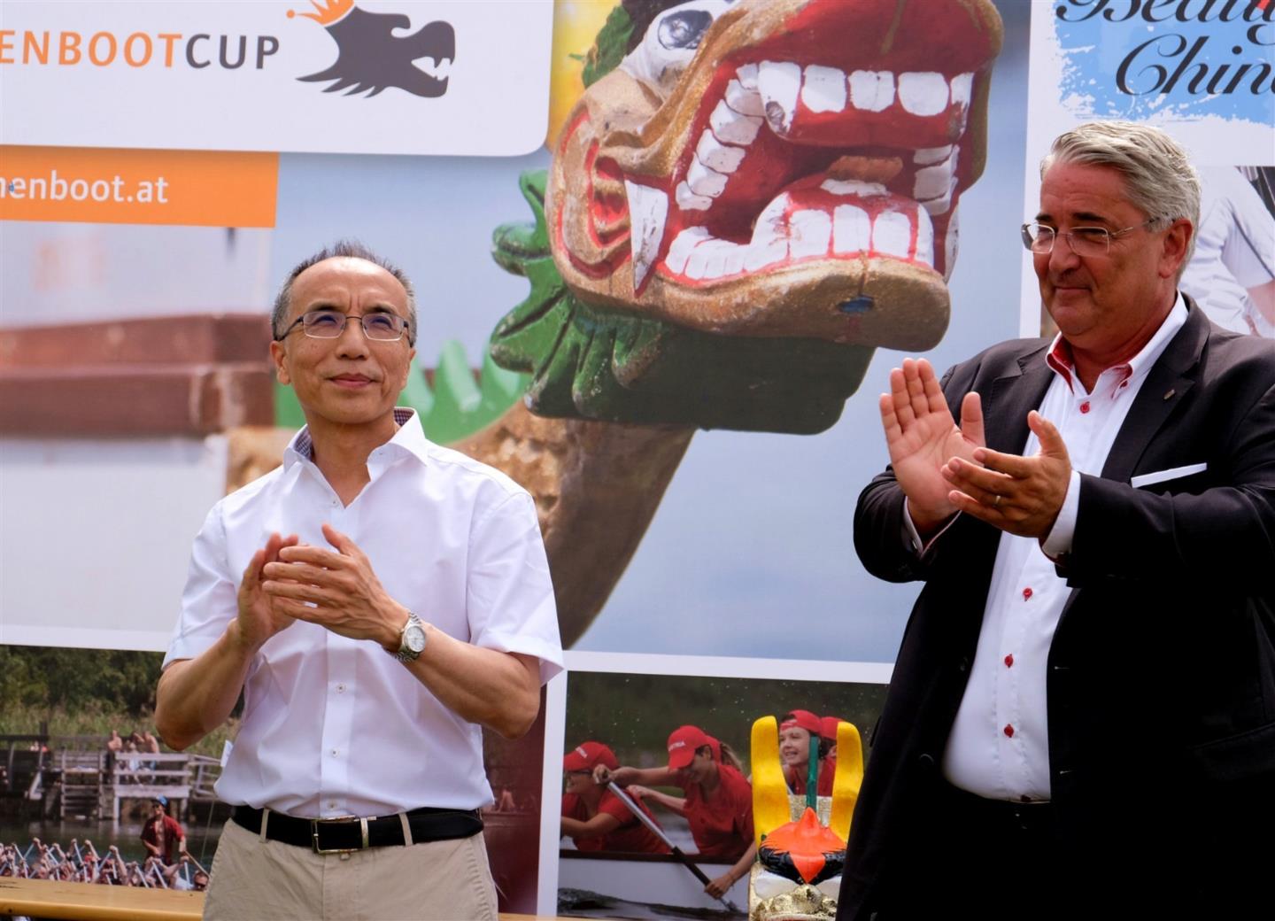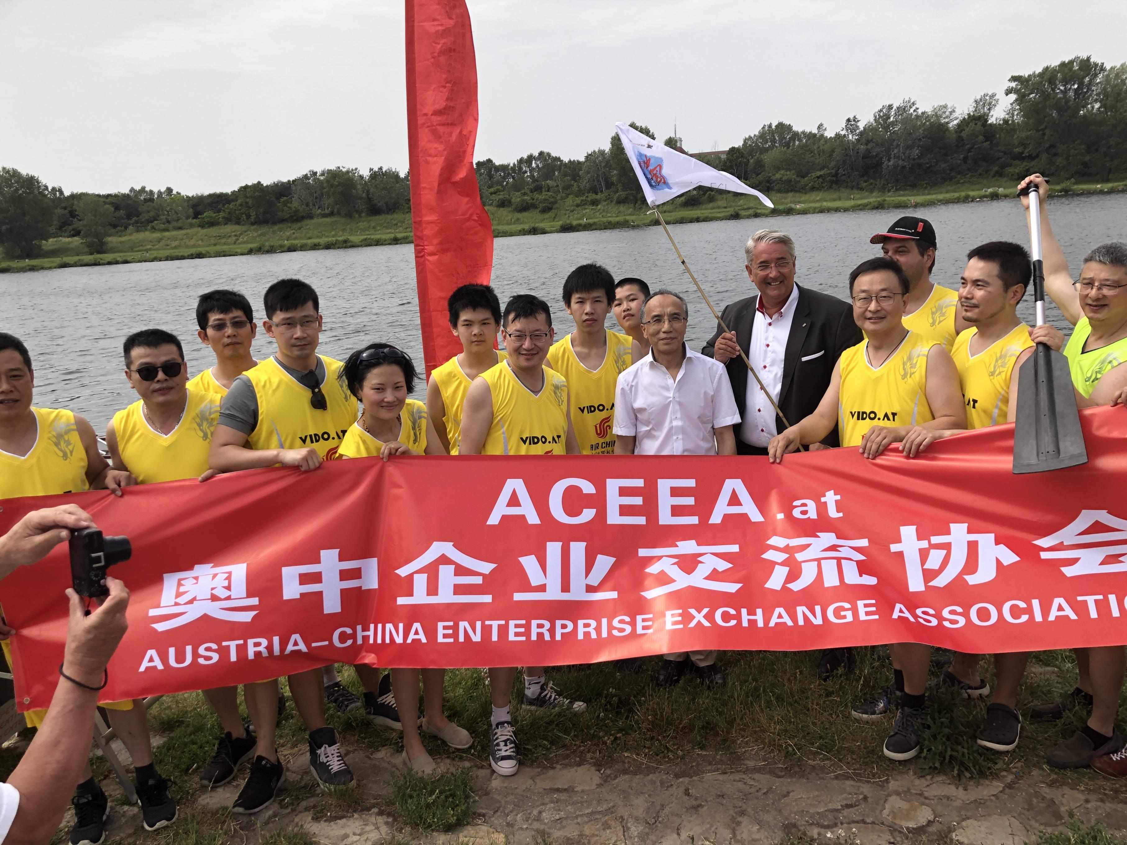 2019年6⽉16⽇,奥中企业交流协会组图参加⼀年⼀度的多瑙河⻰⾈邀请赛,中国驻奥地利使馆李晓驷⼤使、多瑙区区⻓Nevrivy出席活动