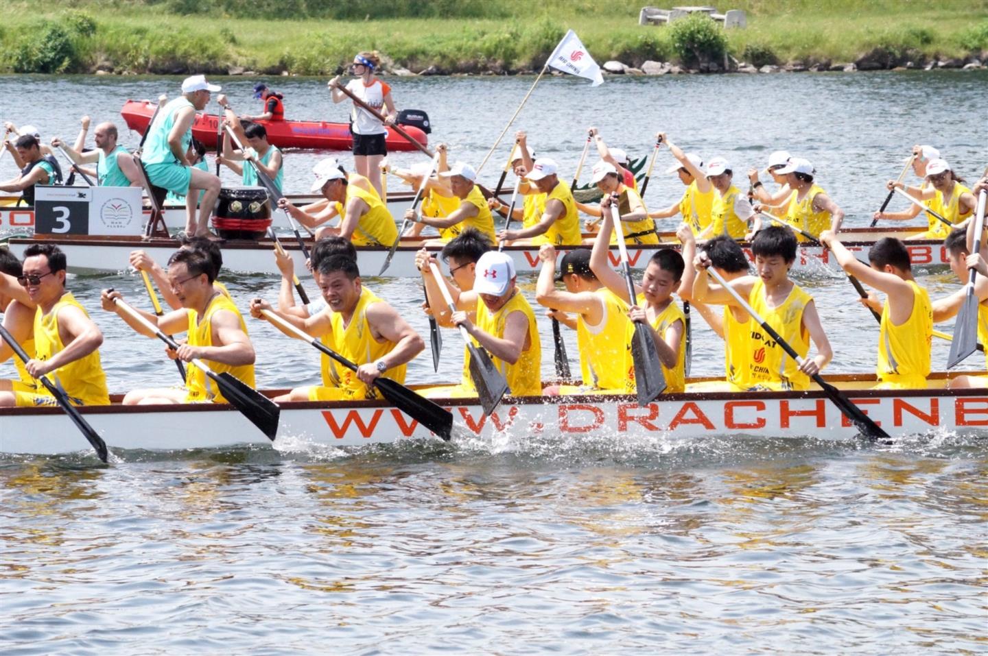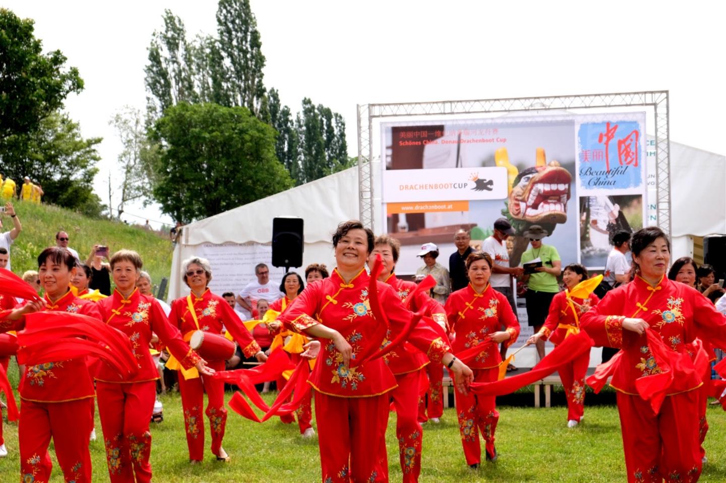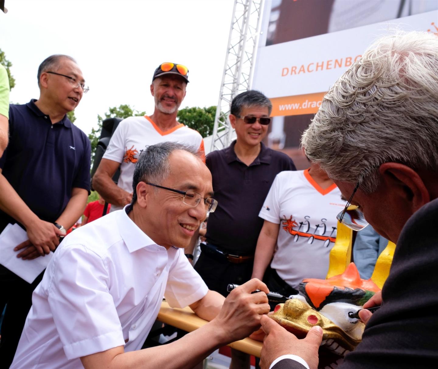 2019年6⽉16⽇,奥中企业交流协会组图参加⼀年⼀度的多瑙河⻰⾈邀请赛,中国驻奥地利使馆李晓驷⼤使、多瑙区区⻓Nevrivy出席活动